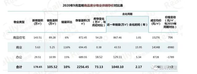 截至本年9月30日,昆明商品房庫存到達2256萬平米,往化周期是2.17年。